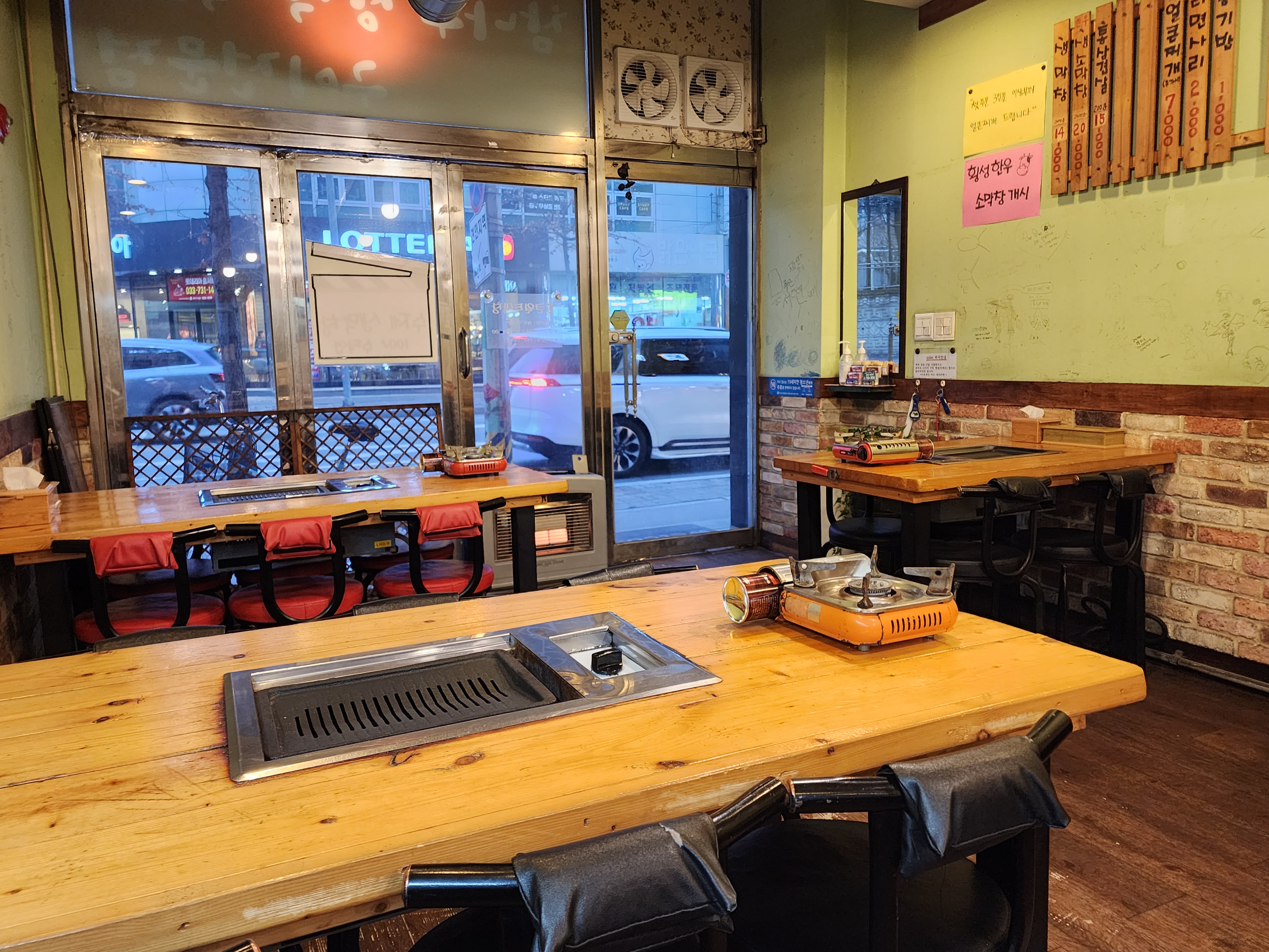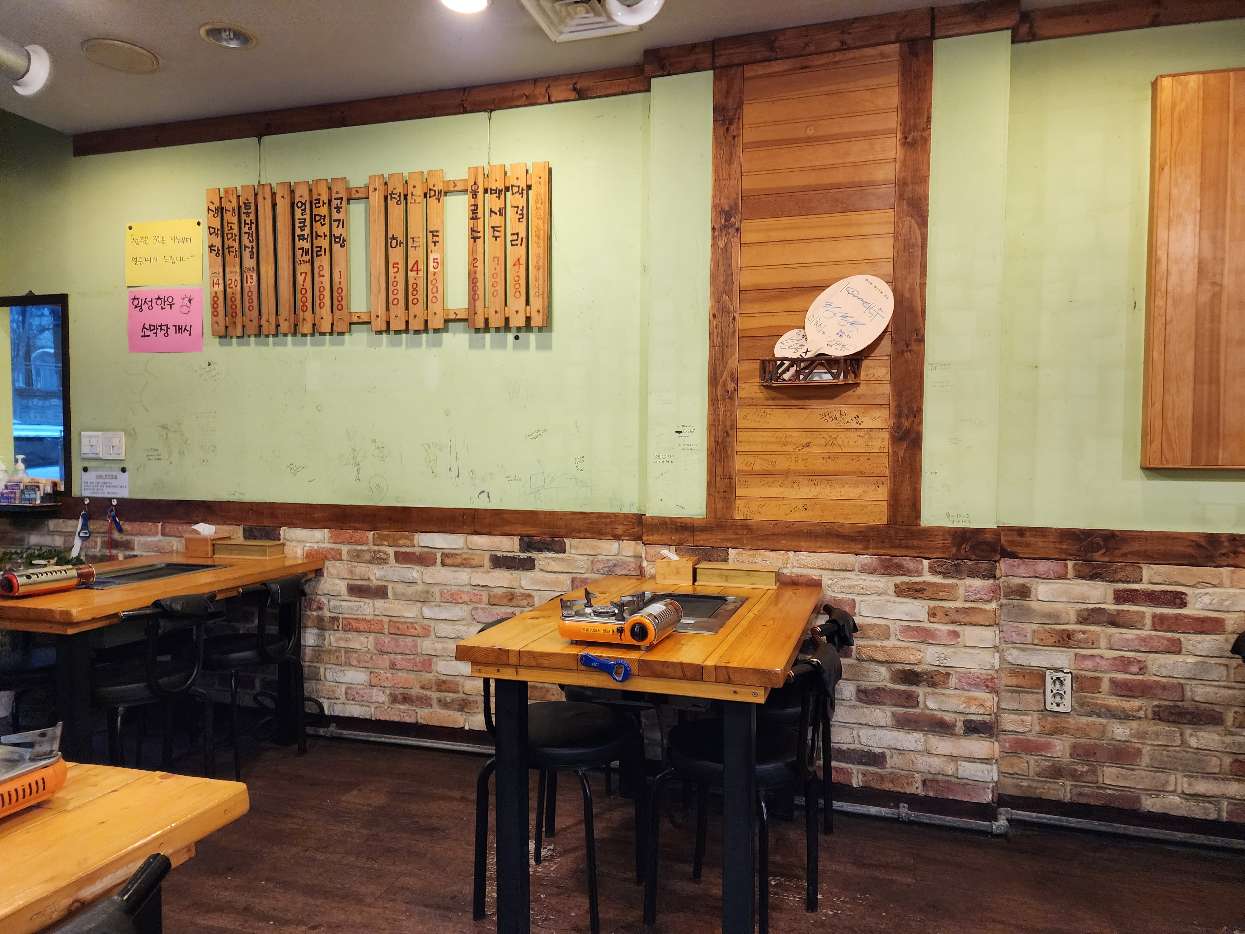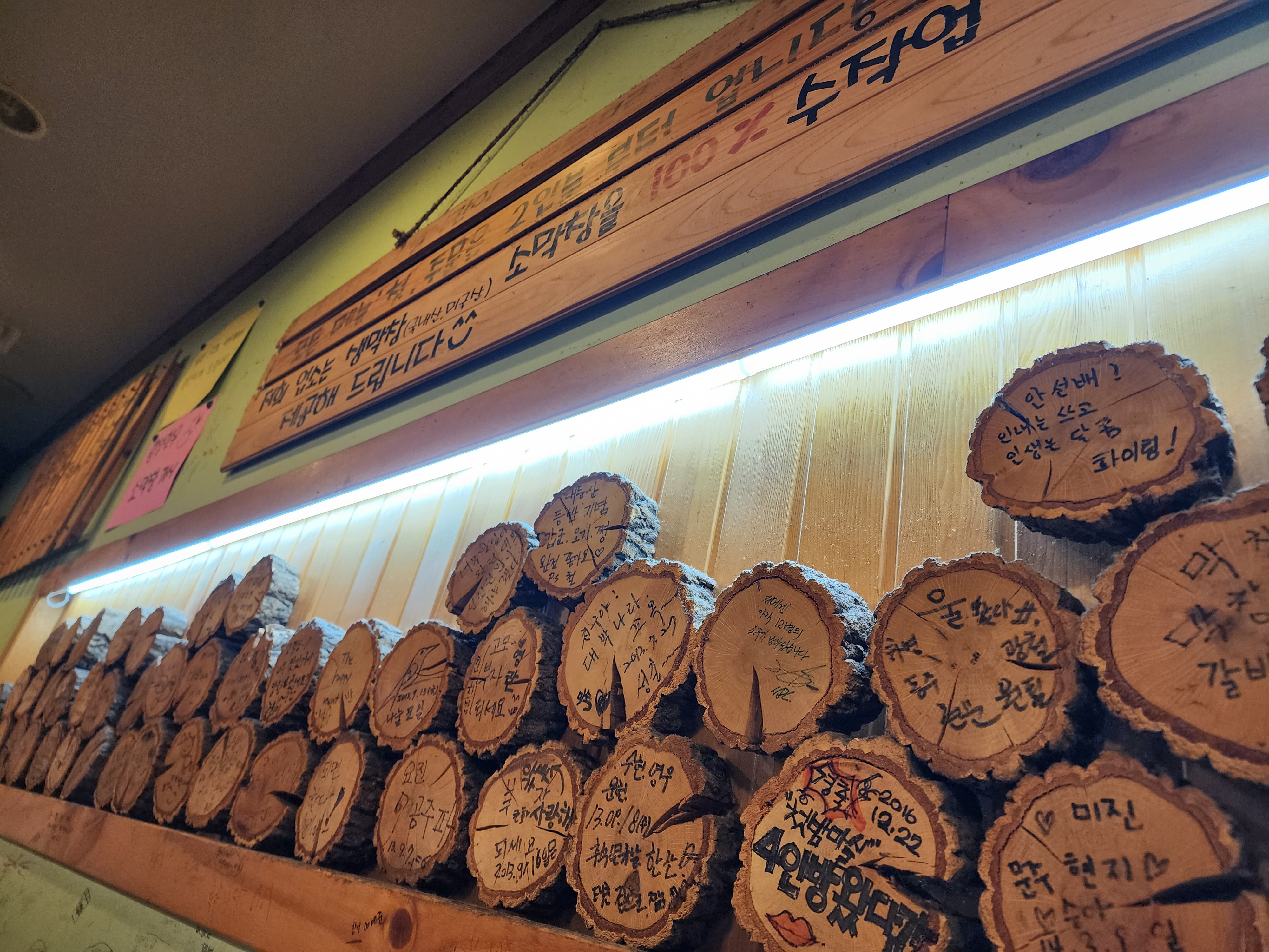 쌓여있는 장작 인테리어에 옛날 정취(가게 방명록 낙서)가 느껴진다.